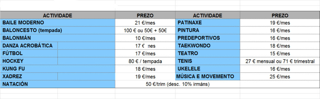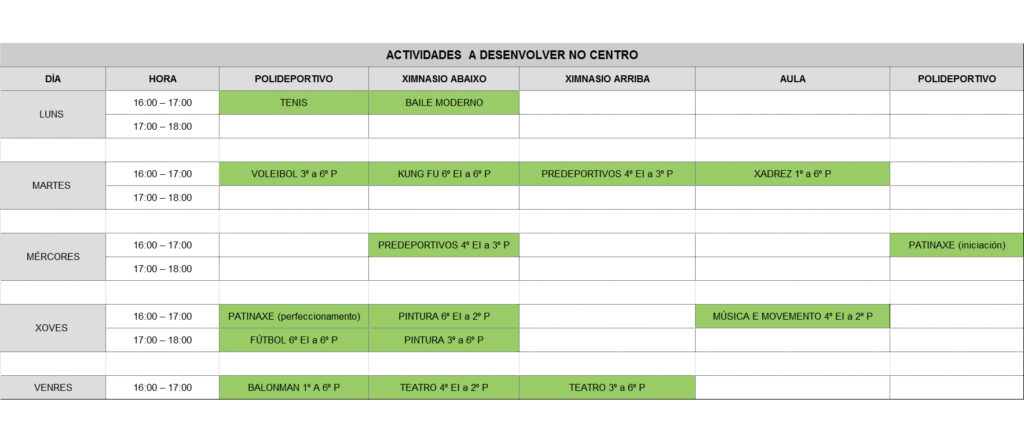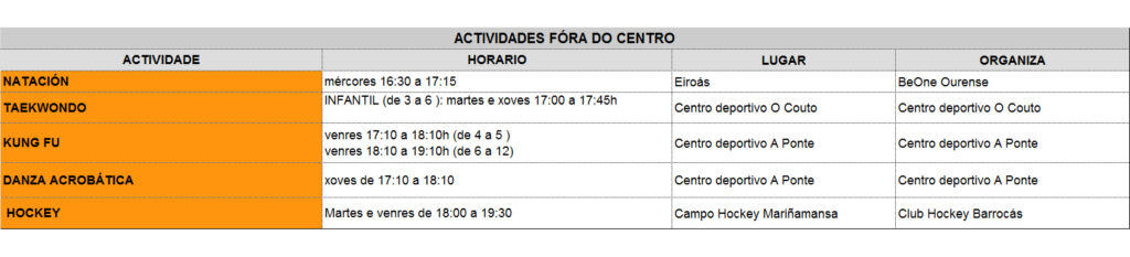 As ACTIVIDADES que se desenvolven FÓRA DO CENTRO, os/as alumnos/as apuntados/as, será preciso acudir os días e horas que teñen establecidas. O pagamente farase directamente ao club ou persoa que desenvolva cada actividade concreta.