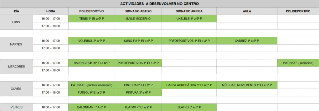 12. As actividades extraescolares rematarán no mes de xuño de 2026. Non haberá actividades na última semana lectiva dese mes.