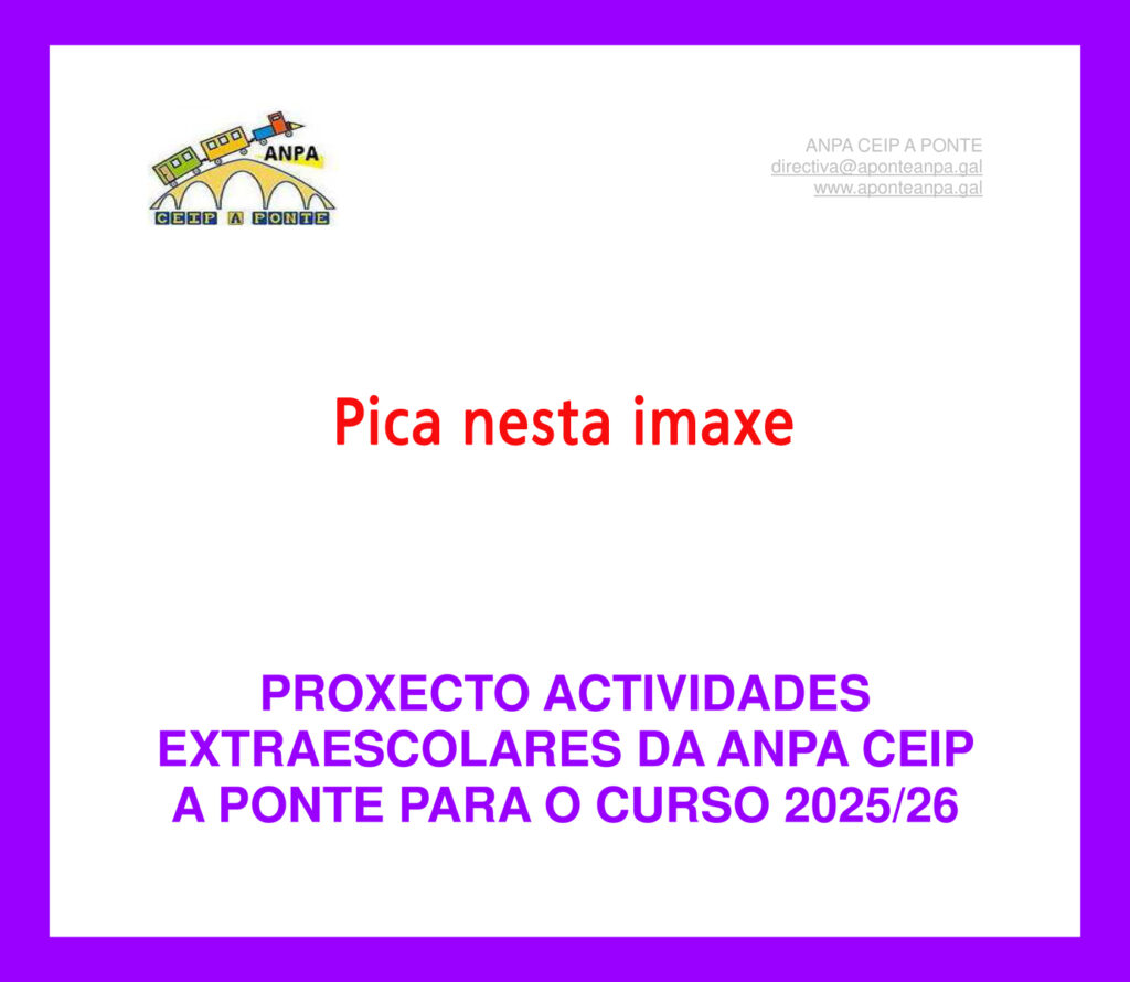 1. A INSCRICIÓN nas actividades extraescolares da ANPA DO CEIP A PONTE para o curso 2025/26 formalizarase únicamente mediante este FORMULARIO ONLINE (pica no enlace).